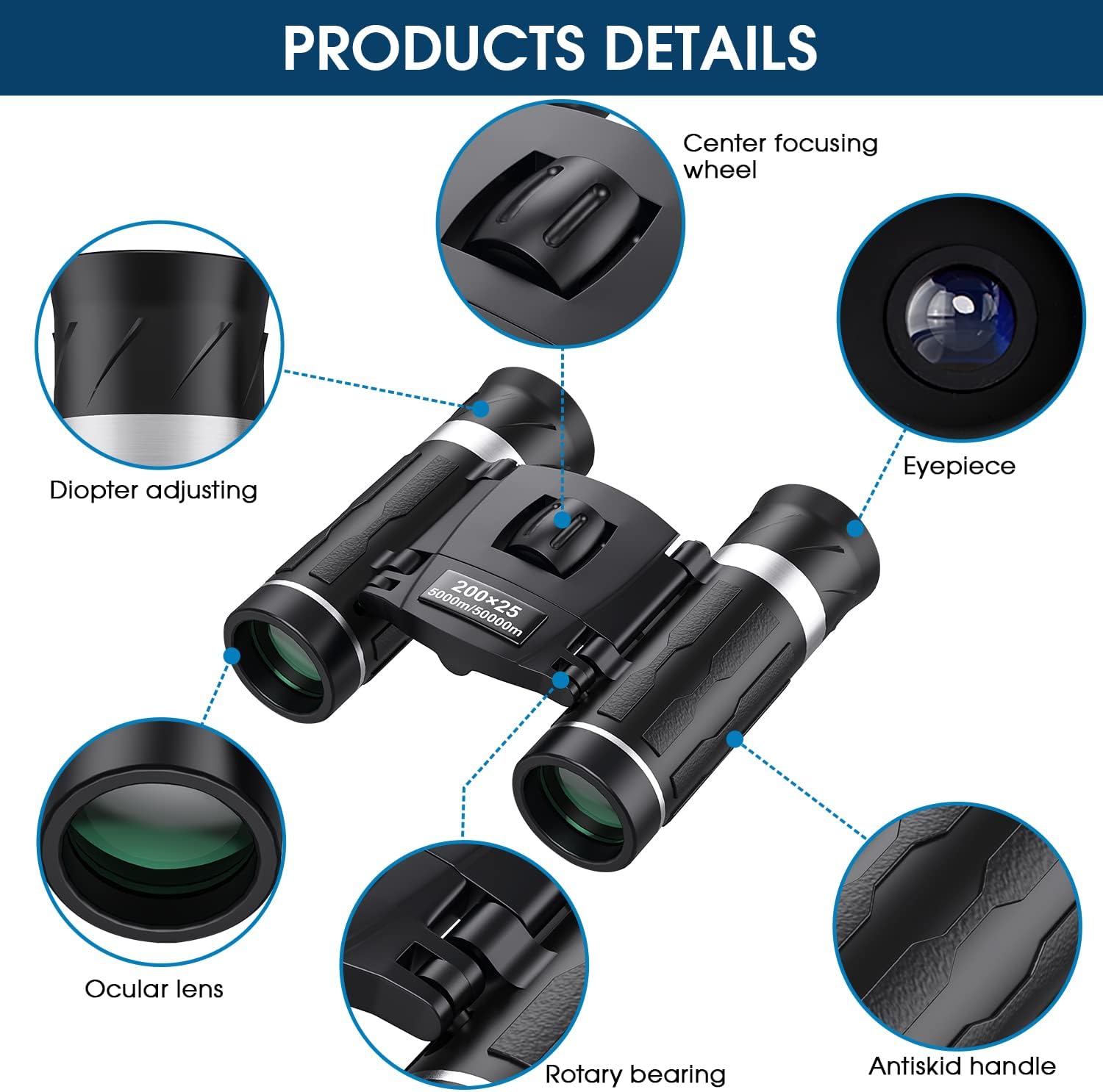 - 200X COMPACT BINOCULARS – Our binoculars are high powered with 200x magnification zoom and a 25mm large field of view. letting you observe and focus on the target in great detail 1000 yards away. It’s ideal binoculars for adults and kids. bird watching. hunting. camping. climbing. hiking. safari. travel. opera. concert. and sports events.