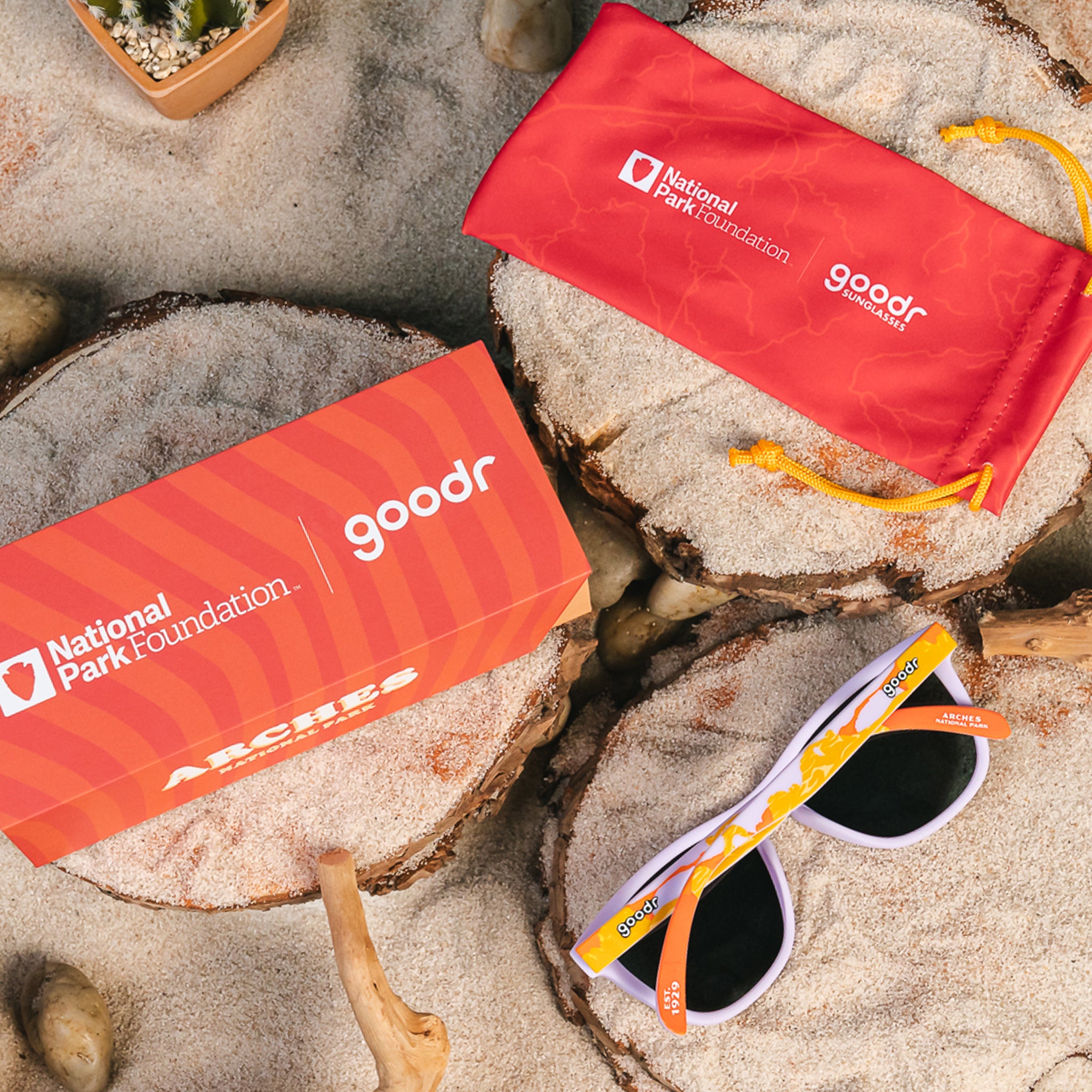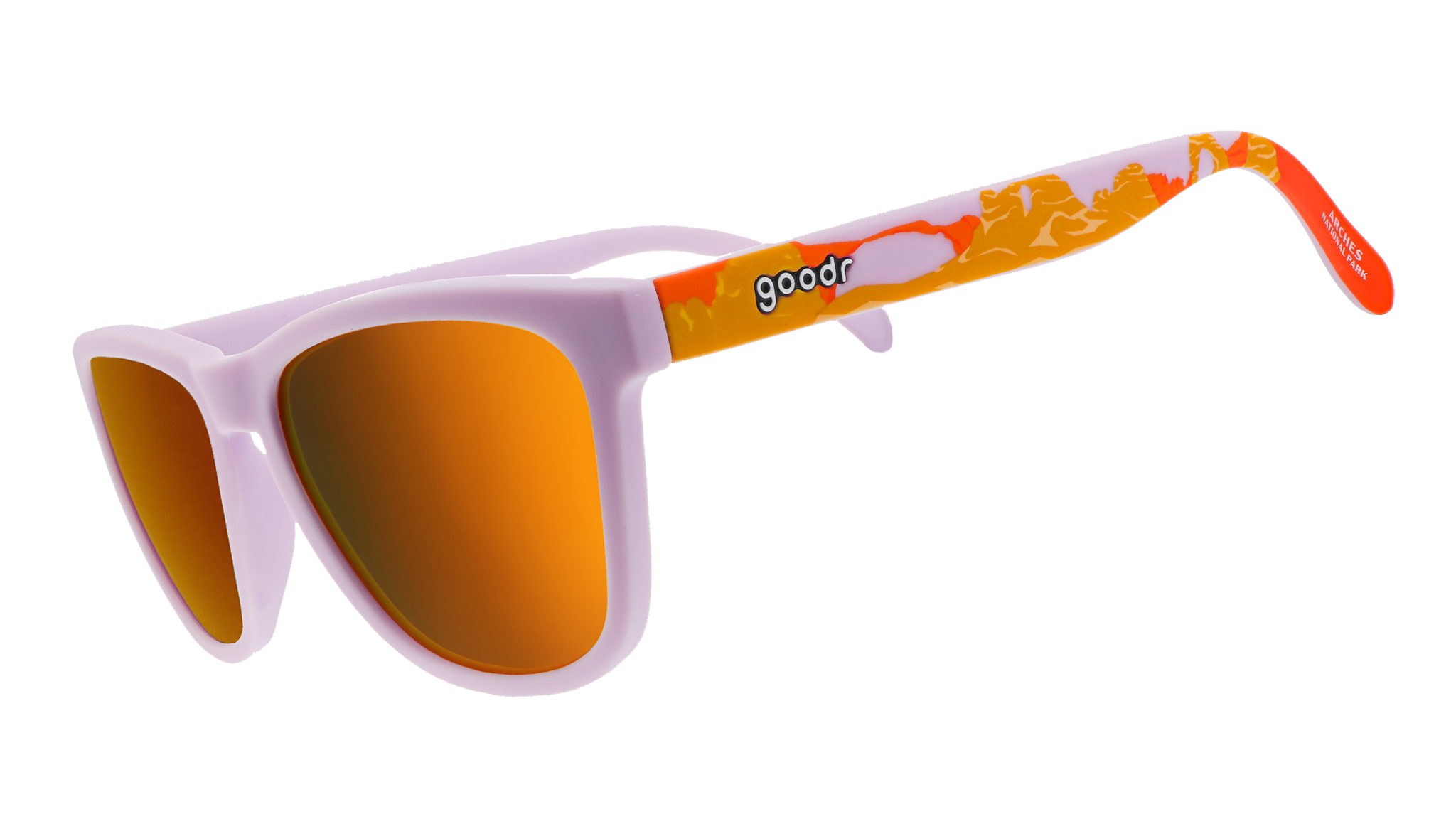 Arches National Park has more than 2.000 natural stone arches. These limited-edition lavender sunglasses with amber reflective lenses feature an iconic landscape design inspired by this beautiful red-rock wonderland.
