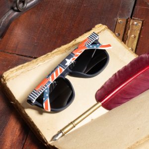 These patriotic 4th of July shades w/ blue reflective lenses are like a quilted yearbook of the Class of 1776. where each patch represents a superlative! This star patch? Ben Franklin: Voted Most Electric Personality. Obvi.