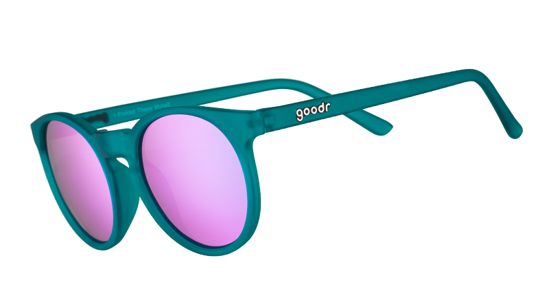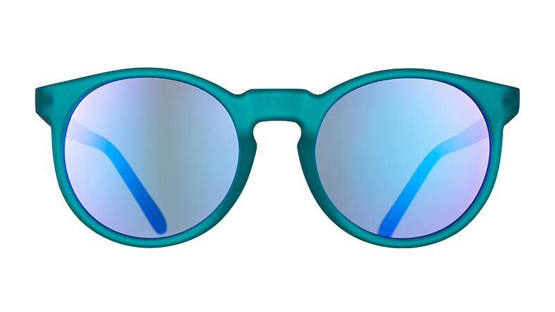 Round teal sunglasses with purple polarized lenses that we pickled especially for you. Your body is a temple. Don’t settle for big-box canned shades. No slip. no bounce frames that stay put even if you sweat. UV400 protection keeps your precious peepers safe and sound.