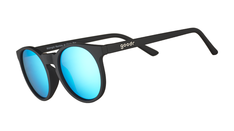 Hipster-inspired round blue lens sunglasses worth rambling about. Fashionable black retro round frames meet functional polarized lenses with/ UV400 protection. Go ahead and get sweaty– the special grip coating and snug. lightweight fit means they won’t slip or bounce.